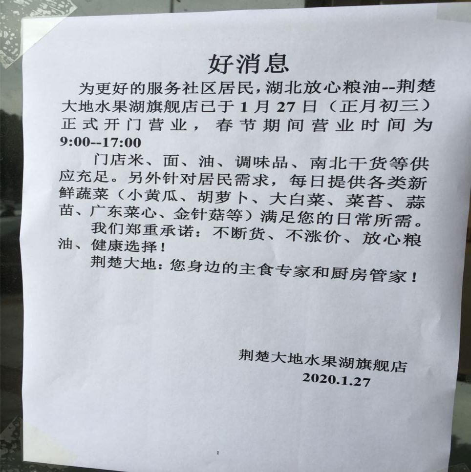 1月27日,“荆楚大地”水果湖旗舰店作为”全国放心粮油示范店”恢复营业,增加蔬菜等物资保供稳价,为周边群众提供生活物资供应。
